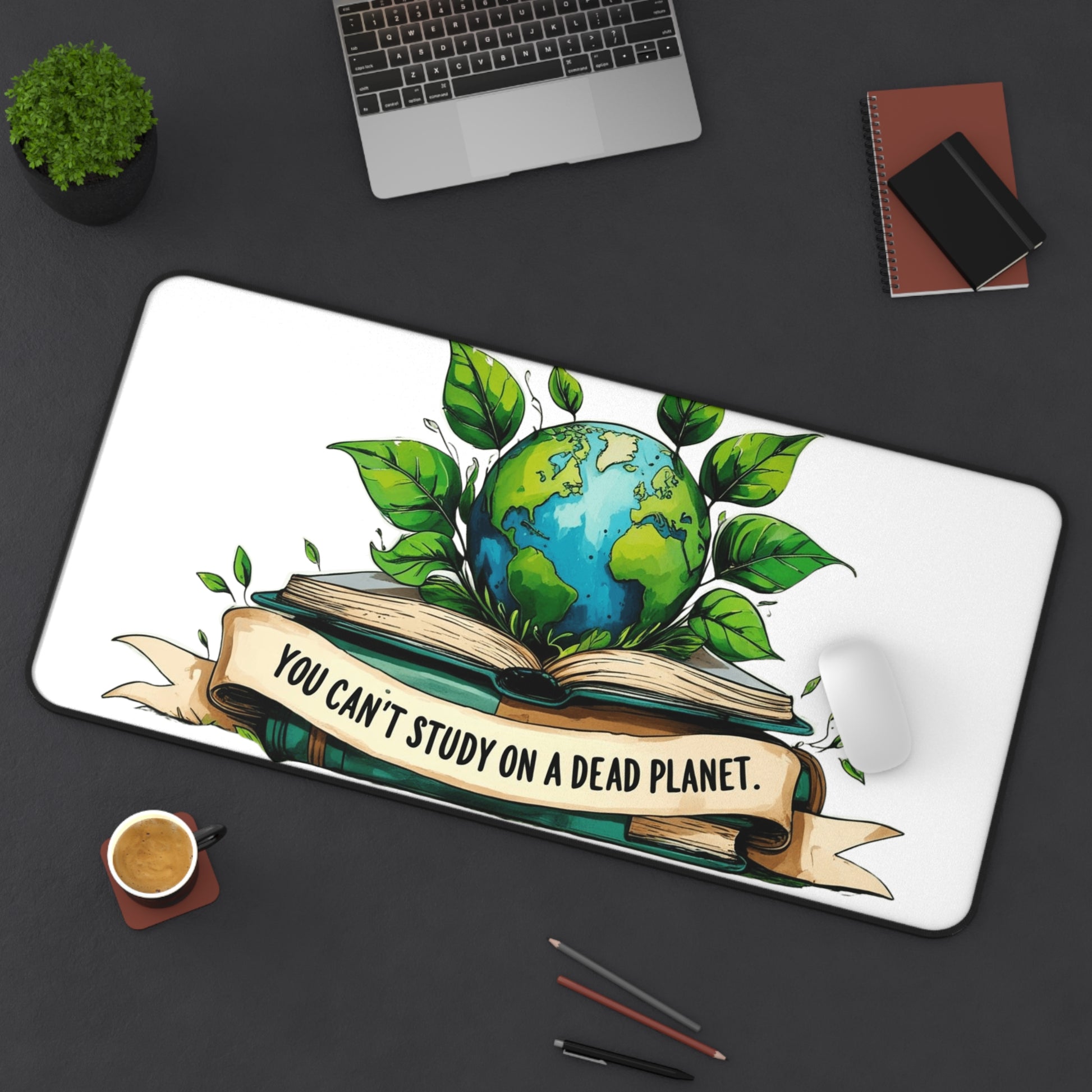 This illustration depicts an open book with a vibrant globe emerging from its pages, surrounded by lush green leaves. The artwork symbolizes environmental education and the interconnectedness of knowledge and planetary health. A banner across the bottom of the image reads "YOU CAN'T STUDY ON A DEAD PLANET," emphasizing the importance of environmental awareness and preservation. The globe is rendered in shades of blue and green, representing the Earth's oceans and landmasses. The illustration style is artistic and somewhat whimsical, with detailed leaves and a hand-drawn aesthetic that gives the image an organic, impactful feel.